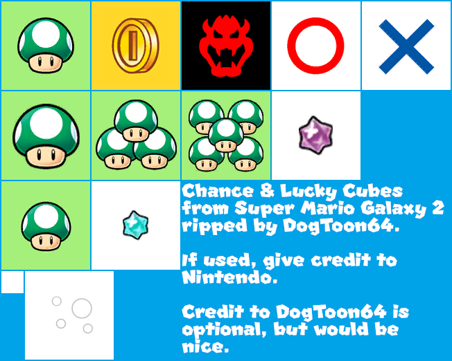 - Added the textures for the Chance Cube as well as a few other missing textures for the Lucky Cube (I just learned that there are apparently two cubes in Super Mario Galaxy 2: Chance Cubes and Lucky Cubes... I should really play the Super Mario Galaxy games again sometime...).